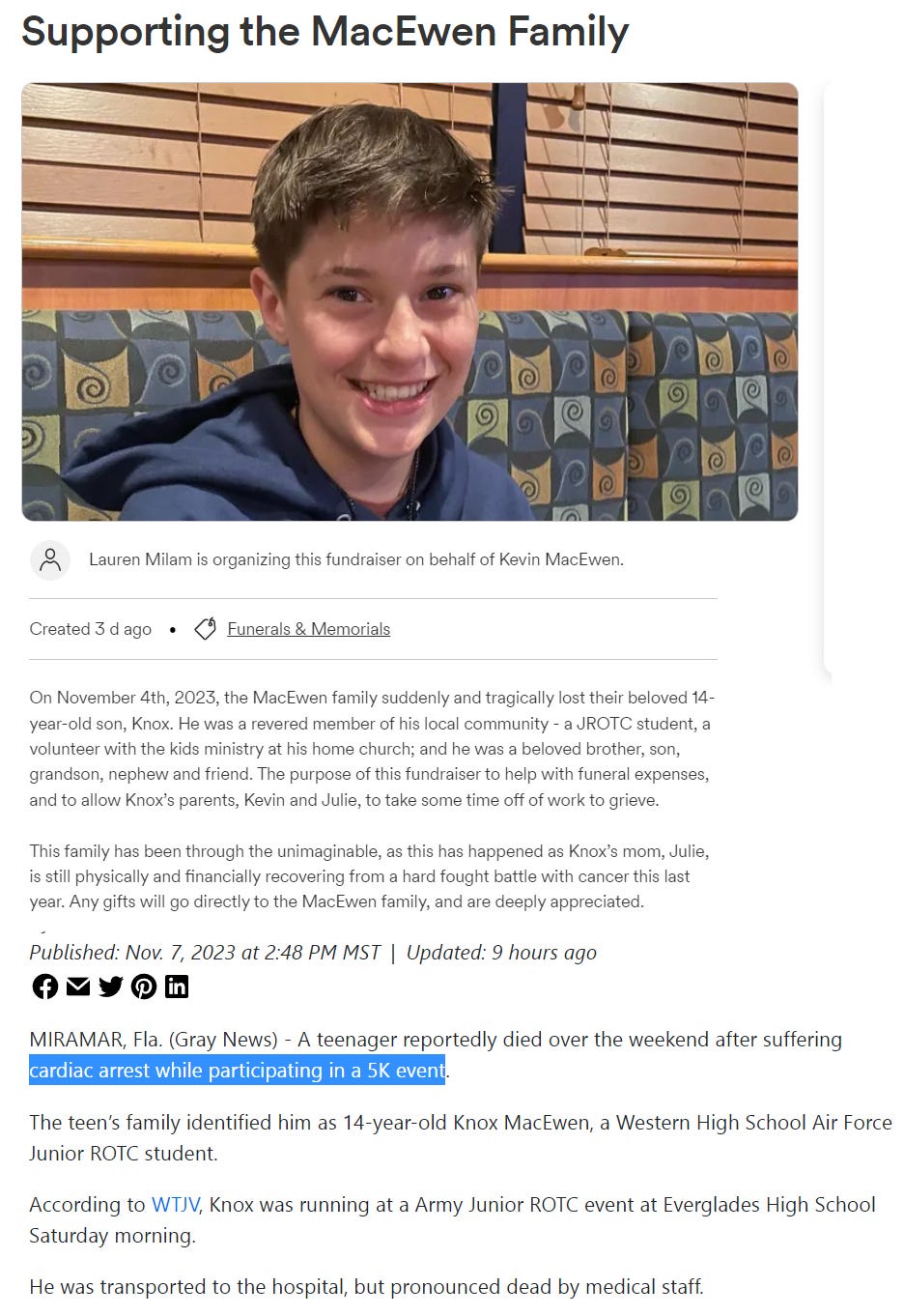 Nov.4, 2023 - Davie, FL - 14 year old Knox MacEwen is a Western High School Air Force Junior ROTC (Junior Reserve Officers’ Training Corps) student. On Nov.4 he was running at a Army Junior ROTC exercise when he suffered a cardiac arrest during a 5K run and died in the hospital. His mother is recovering from a hard fought battle with cancer this past year.
