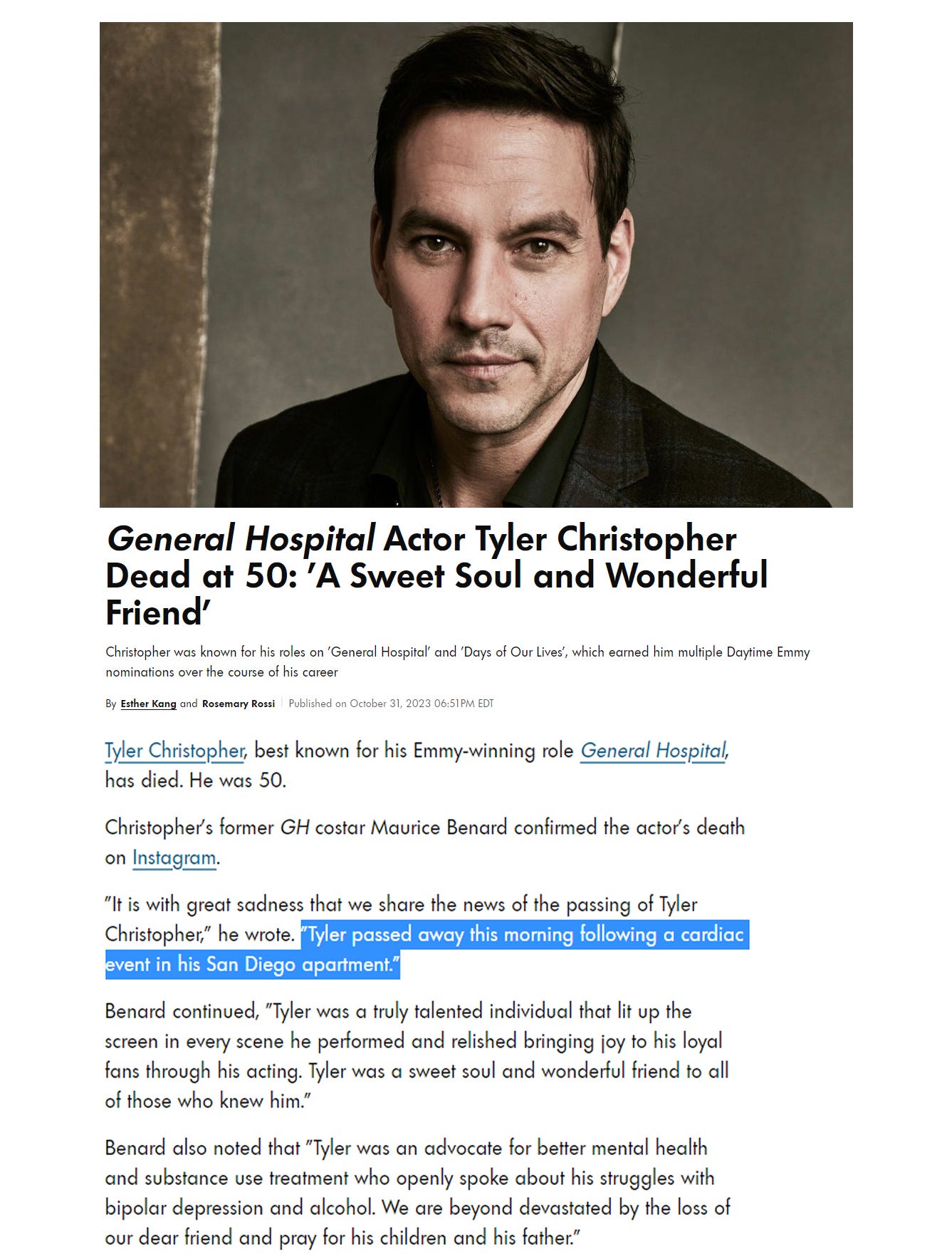 ACTORS Dying suddenly - Matthew Perry (age 54), Tyler Christopher (age 50) are the most recent losses - 34 young Actors and Actresses who died suddenly in 2023 - many had autopsies done