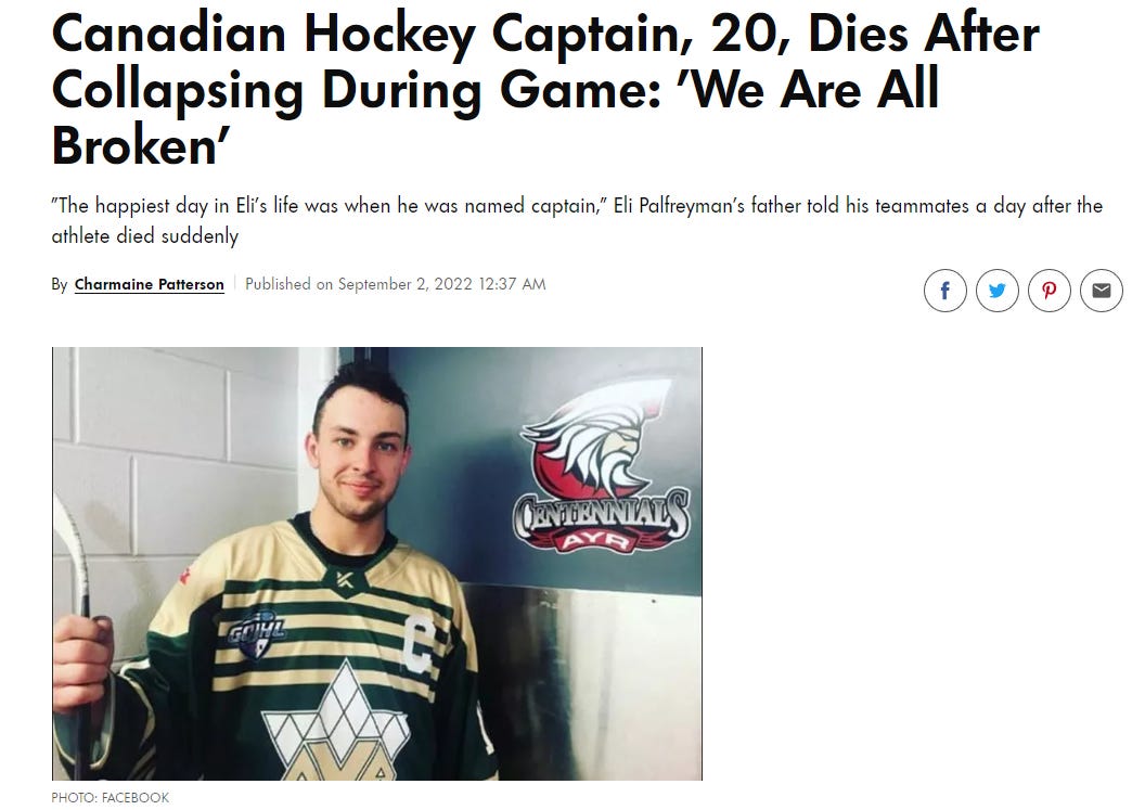 Eli Palfreyman, the 20-year-old captain of the Ayr Centennials, was in the locker room during a pre-season game when he collapsed Tuesday night (August 30, 2022), CBC reported. His mother rushed to the changing room, and the team's trainer began to perform chest compressions. His pulse had become faint by the time he was put in an ambulance and taken to a local hospital. He died shortly after.”