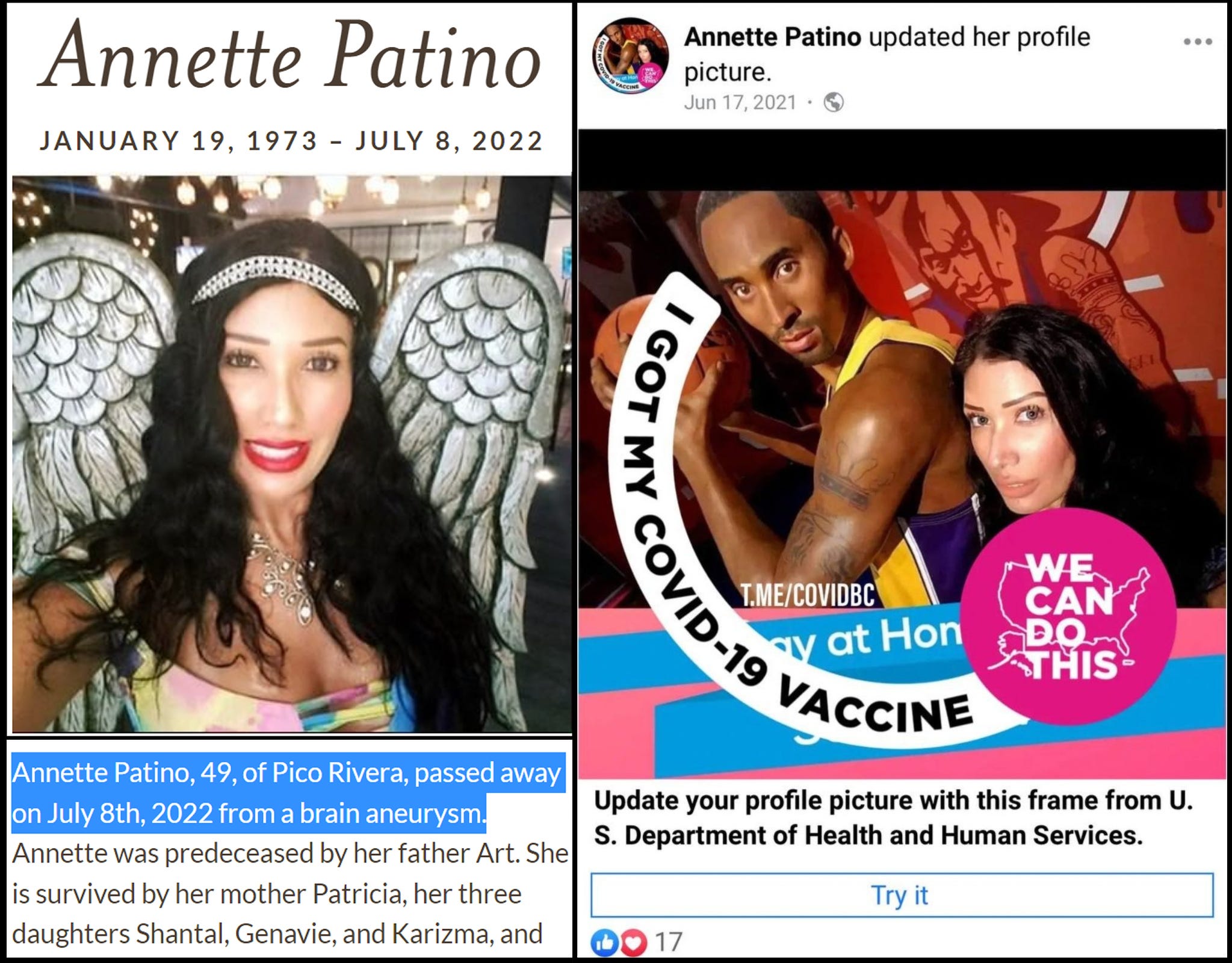 July 8, 2023 - Pico Rivera, CA - 49 year old NURSE Annette Patino, died suddenly from a brain aneurysm (click here)