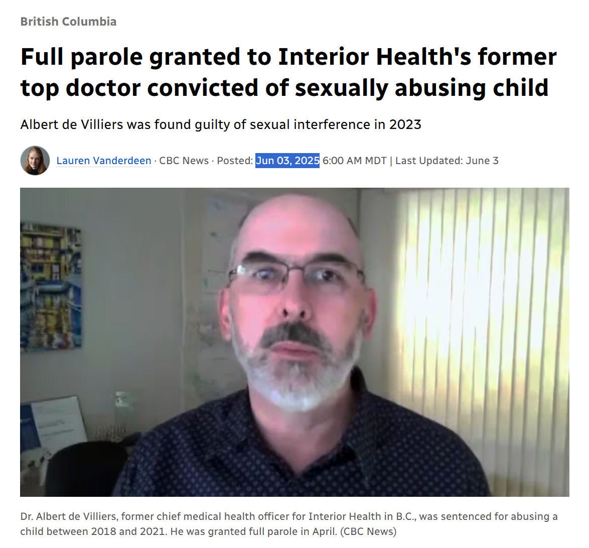 BREAKING NEWS: Alberta's highest profile PEDOPHILE, Dr. Albert de Villiers, former AHS Executive & Premier Danielle Smith Health Minister's favorite doctor, has been released back into the community!