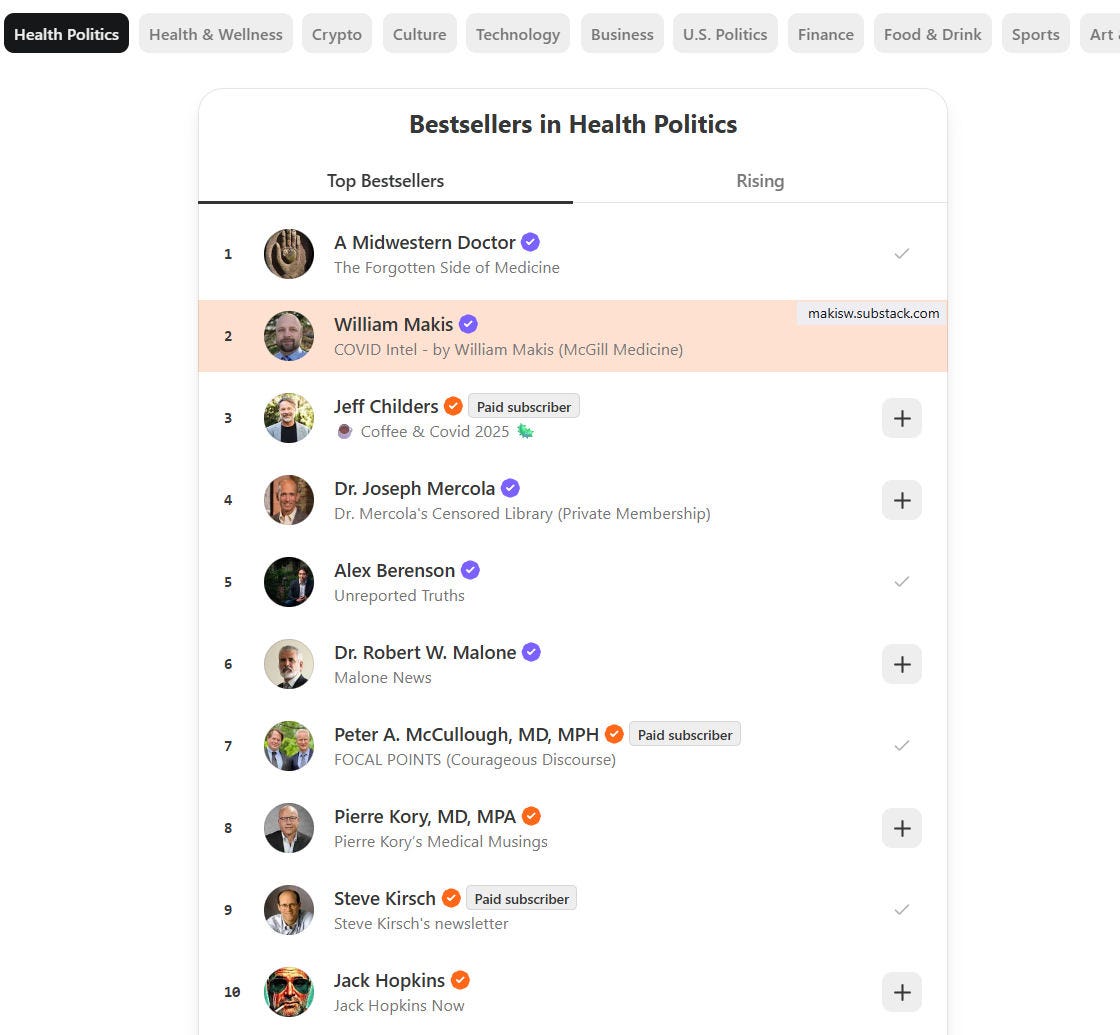 BREAKING NEWS: My substack “COVID Intel” has risen to #2 Healthcare publication in the world!!