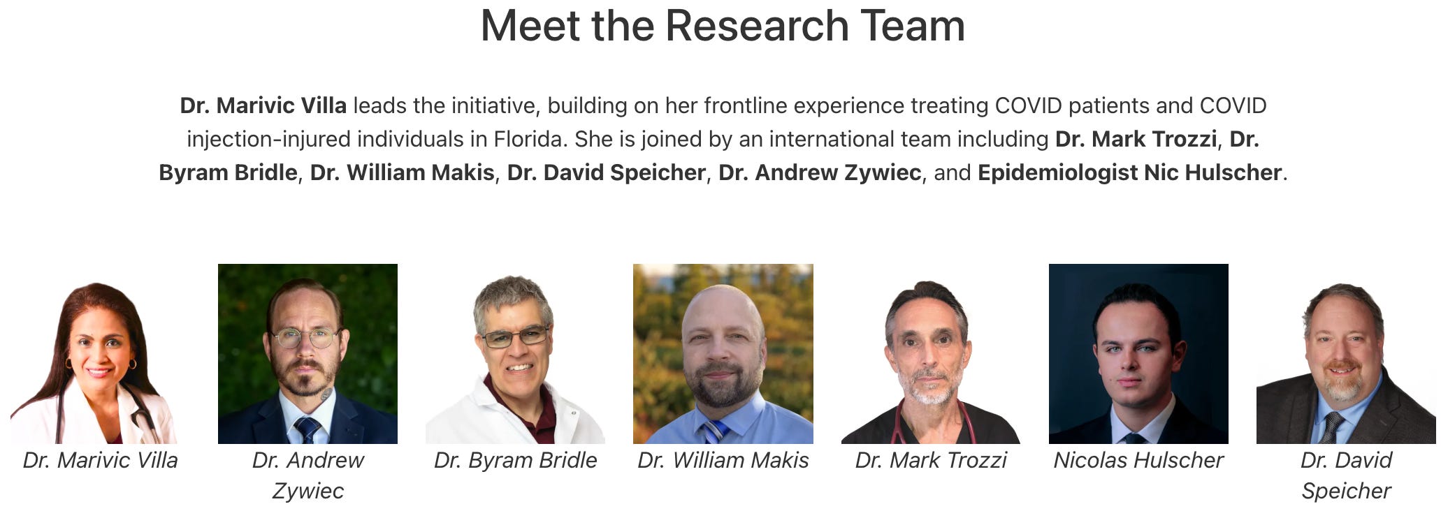 Every member of our research team — including Dr. Marivic Villa, Dr. Mark Trozzi, Dr. Byram Bridle, Dr. William Makis, Dr. David Speicher, Dr. Andrew Zywiec, and Epidemiologist Nicolas Hulscher — is donating their time and expertise.