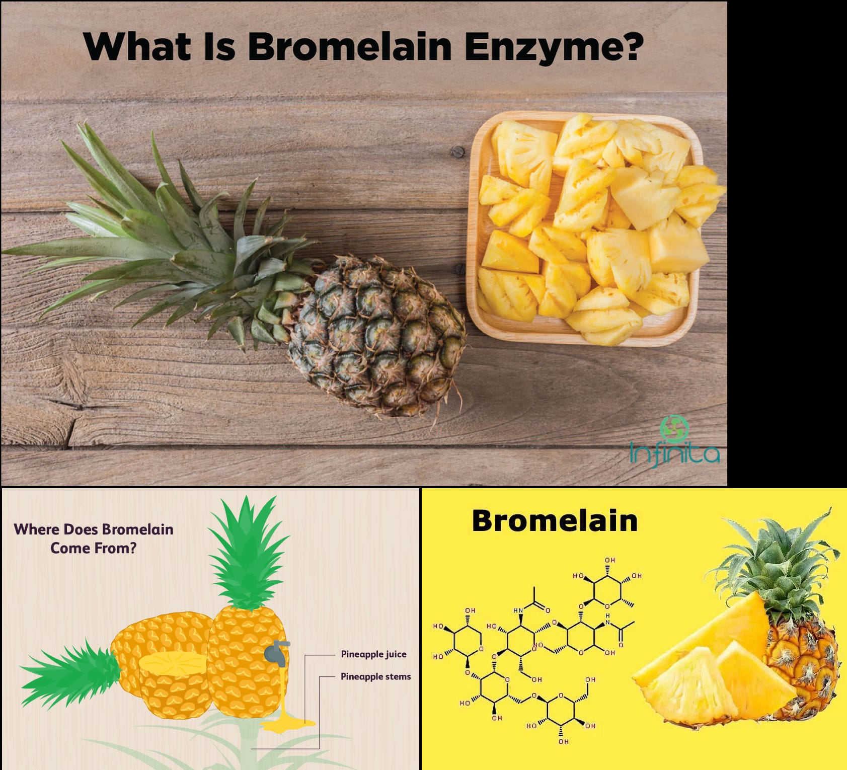 Bromelain is a key enzyme found in pineapple and has been known since 1876. Bromelain is typically extracted from the stems but can also be extracted from the fruit. Stems have higher concentration of Bromelain than the fruit.