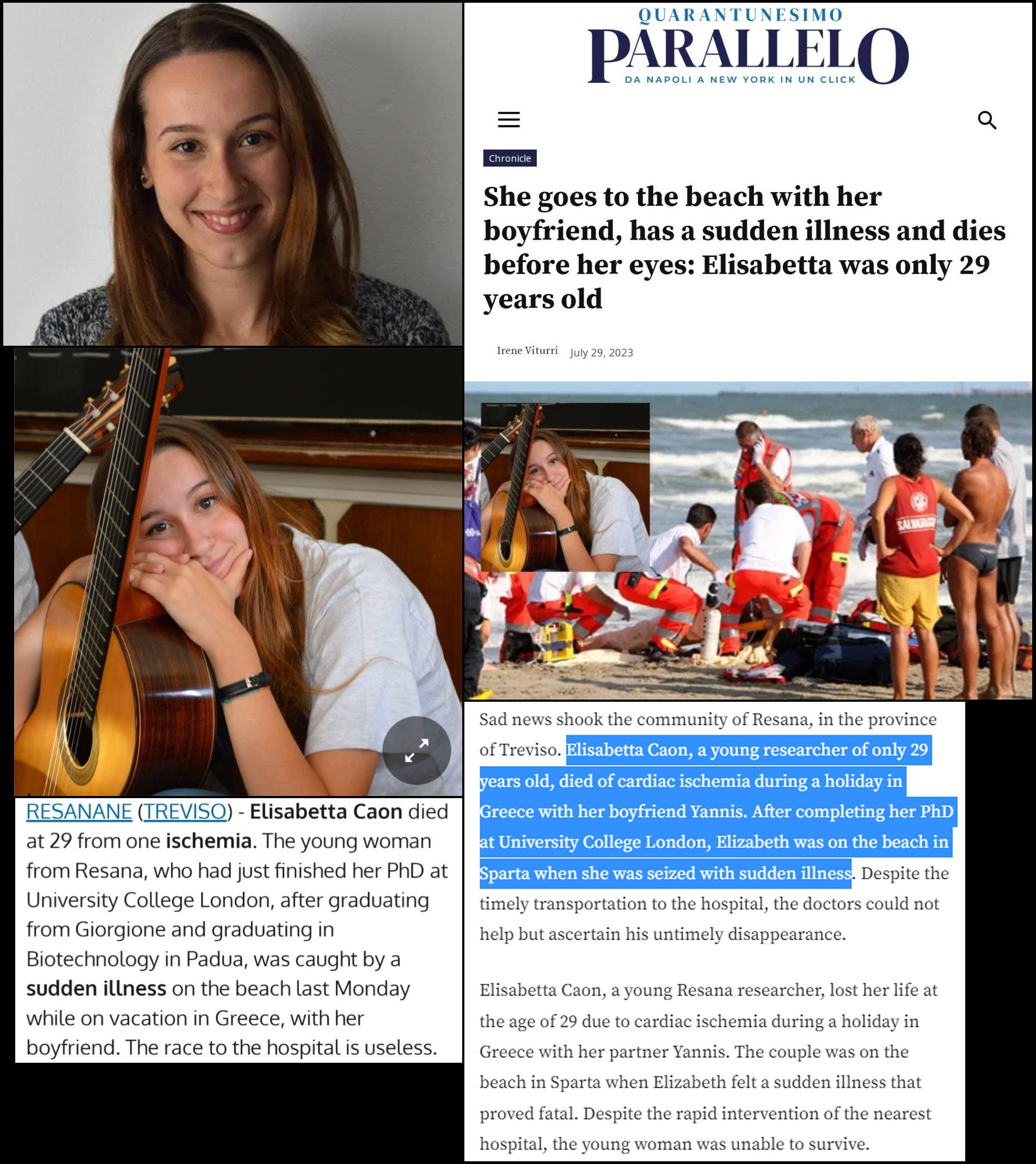 July 29, 2023 - 29 year old Elisabetta Caon, who just completed her PhD at University College London in biotechnology, was on holiday in Greece with her partner, when she collapsed on the beach, could not be revived and died of sudden cardiac arrest (click here)