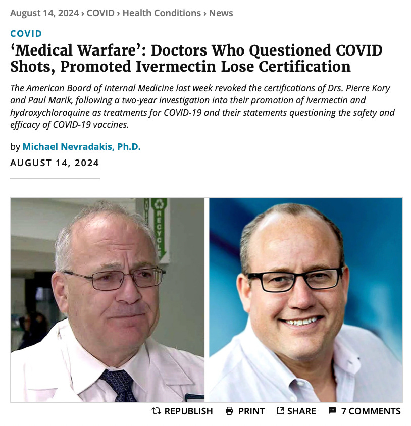 The American Board of Internal Medicine (ABIM) last week revoked the certifications of Drs. Pierre Kory and Paul Marik, following a two-year investigation into their promotion of ivermectin and hydroxychloroquine as treatments for COVID-19 and their statements questioning the safety and efficacy of COVID-19 vaccines.