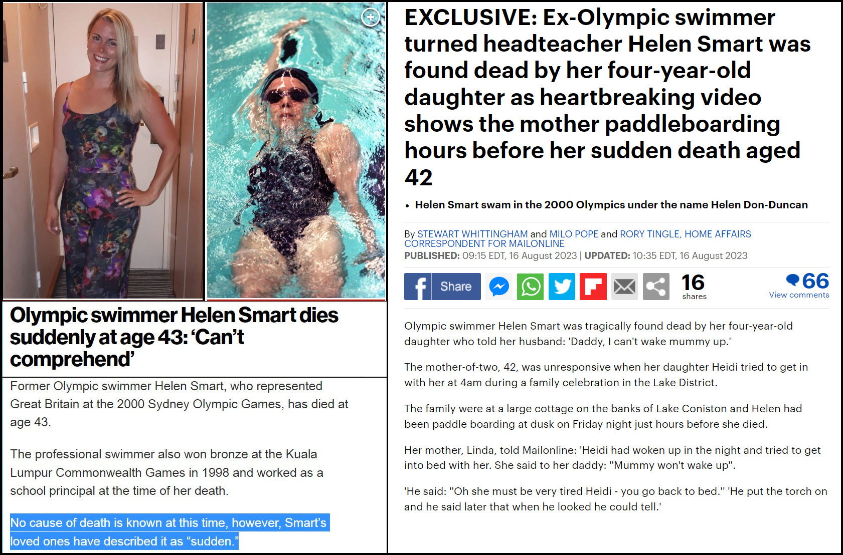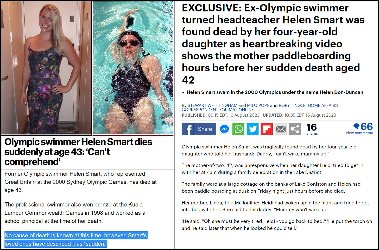 Aug.12, 2023 - Olympic swimmer Helen Smart, age 43 (working as teacher in Wigan, UK) died suddenly in her sleep on Aug.12, 2023