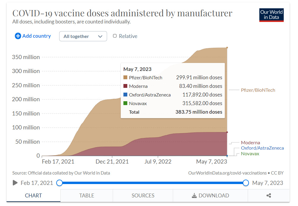 Japan has administered 384 million COVID-19 mRNA vaccine doses, approximately 78% Pfizer and 22% Moderna. (click here)
