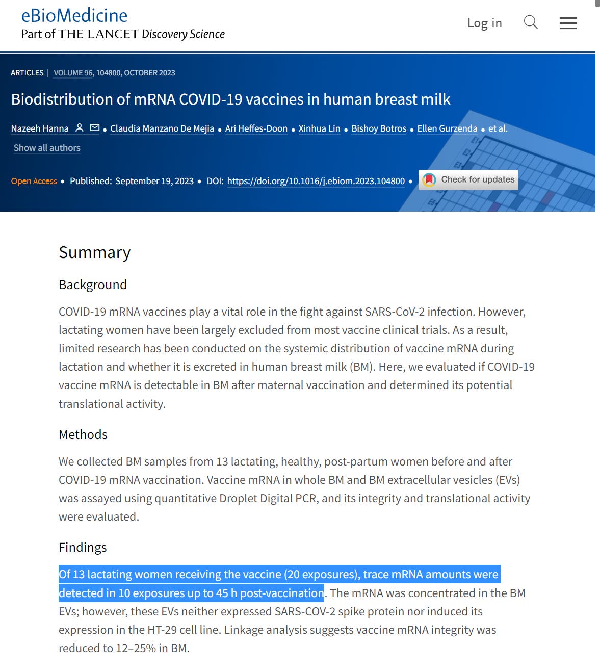 NEW Sep.19, 2023 STUDY REVIEWED: (Hanna et al) Biodistribution of COVID-19 mRNA vaccines in human breast milk