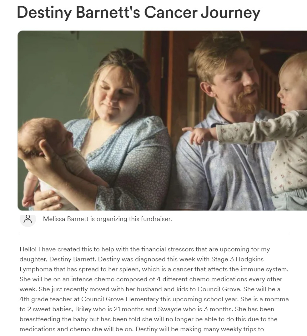 July 21, 2023 - Spearville, KS - Destiny Barnett, a 4th grade teacher, was diagnosed with Stage 3 Hodgkin Lymphoma 3 months after giving birth to Swayde.