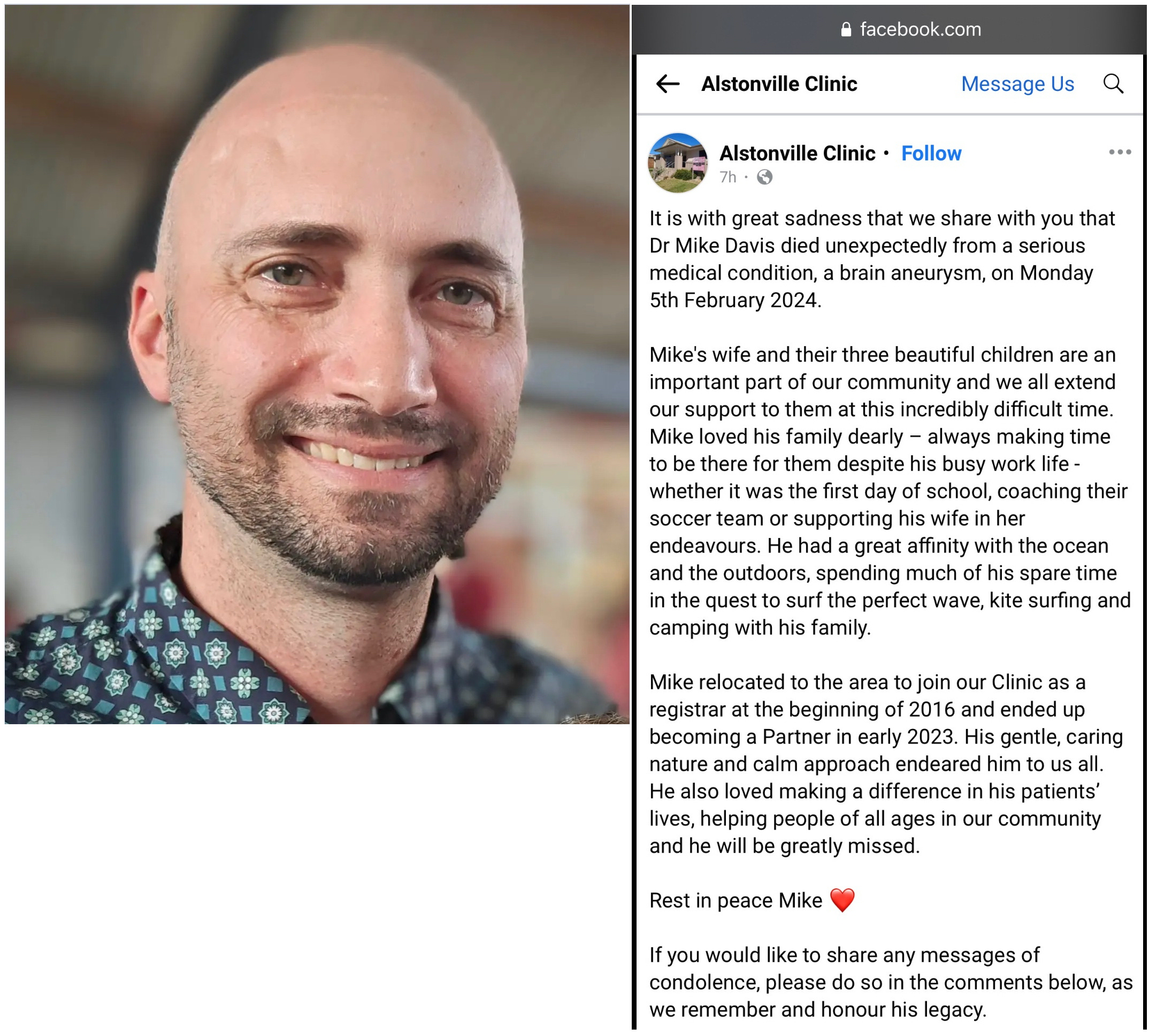 Feb.5, 2024 - NSW, Australia - Dr.Mike Davis died unexpectedly from a brain aneurysm on Feb.5, 2024. He leaves behind 3 children.