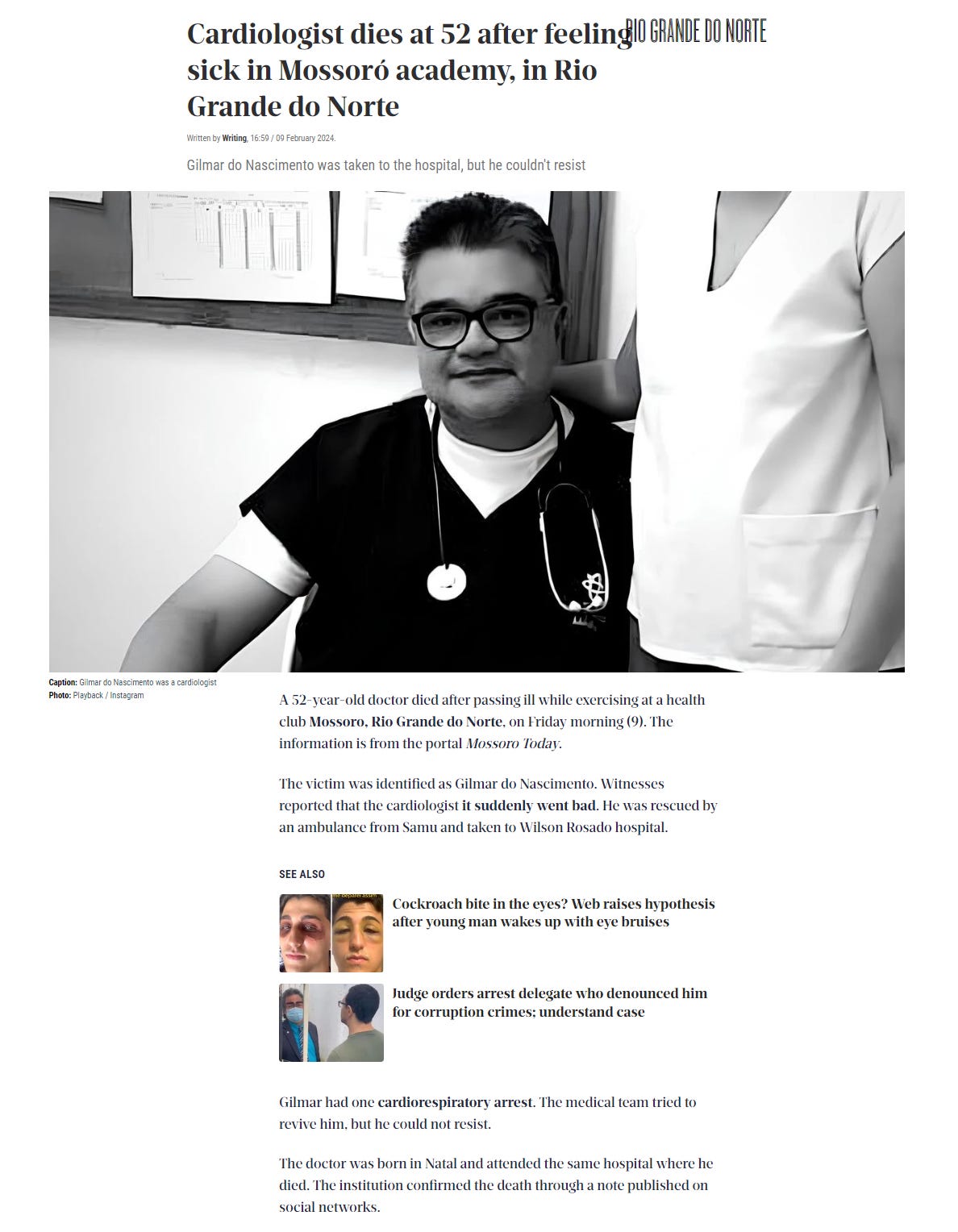 Feb.9, 2024 - BRAZILIAN DOCTOR DEAD - 52 year old Cardiologist Dr.Gilmar Do Nascimento collapsed while exercising at a health club and died suddenly on Feb.9, 2024.