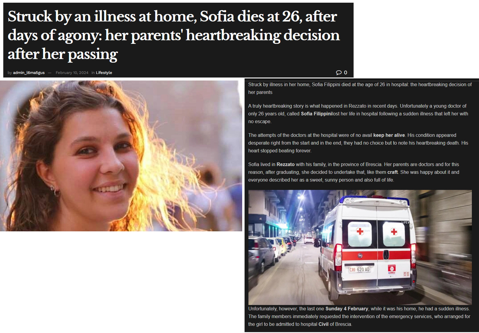 Feb.4, 2024 - Brescia, Italy 26 year old Dr.Sofia Filippini had a "sudden illness" at her home on Feb.4, 2024 and died unexpectedly in the hospital.