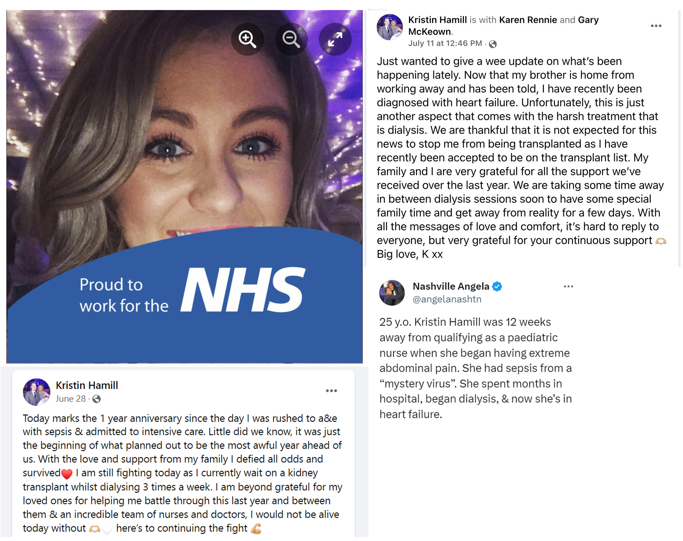July 11, 2023 - Inverkip, UK - 25 year old NHS pediatric nurse Kristin Hamill was finishing her pediatric nursing studies (with COVID-19 mRNA Vaccine mandate). On June 28, 2022 she developed sepsis, her kidneys failed, she ended up on dialysis and needs a kidney transplant. In July 2023 she was diagnosed with heart failure - all COVID-19 mRNA Vaccine injuries & long term effects.