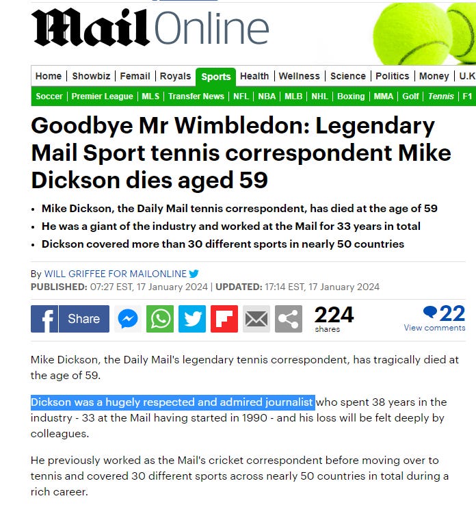 mRNA Injury stories - British journalist Mike Dickson, who attacked World #1 Tennis player Novak Djokovic for being unvaccinated, died suddenly during Australian Open - journalists and medical fascism
