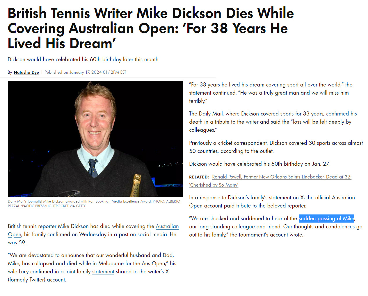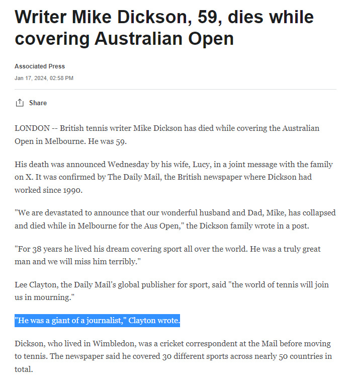 Jan.17, 2024 - mRNA Injury stories - 59 year old British journalist Mike Dickson, who attacked World #1 Tennis player Novak Djokovic for being unvaccinated, died suddenly while covering the Australian Open