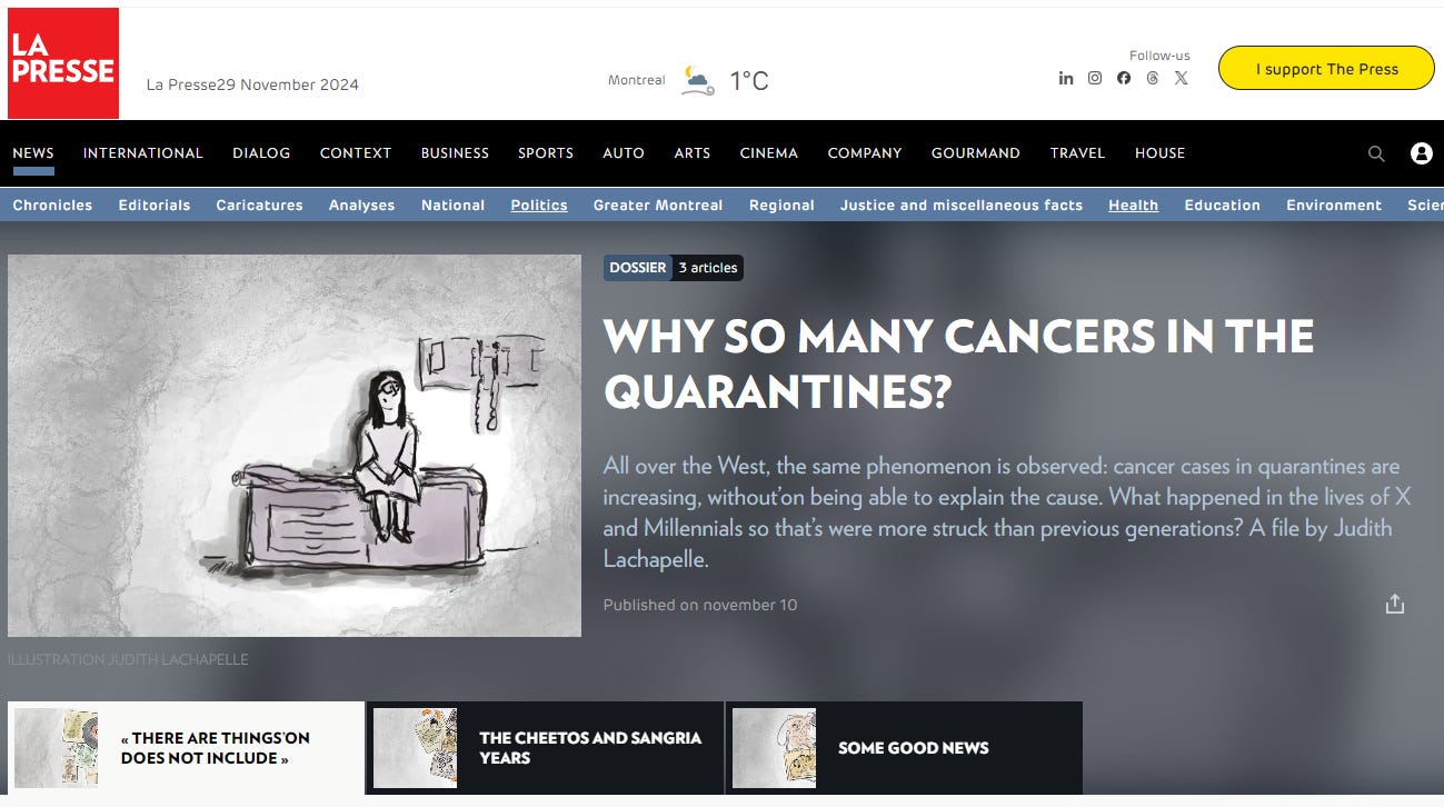 NEWS: Breast Cancer rates are up 45% in Canada according to LaPresse, doctors are completely baffledWilliam MakisNov 29, 2024∙ Paid1353021ShareContinue reading this post for free, courtesy of William Makis.Claim my free postOr purchase a paid subscription.