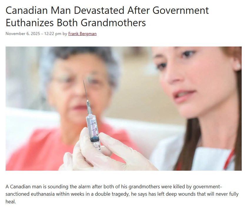 NEWS: Canadian Man Devastated After Government Euthanizes Both GrandmothersWilliam MakisMar 27, 2026∙ Paid1432622ShareContinue reading this post for free, courtesy of William Makis.Claim my free postOr purchase a paid subscription.