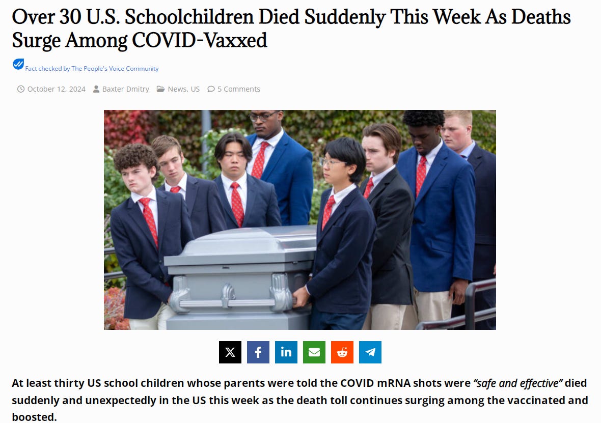 NEWS: Over 30 U.S. Schoolchildren Died Suddenly This Week As Deaths Surge Among COVID-VaxxedWilliam MakisOct 28, 2024∙ Paid2679047ShareContinue reading this post for free, courtesy of William Makis.Claim my free postOr purchase a paid subscription.