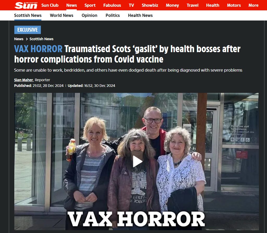 NEWS: VAX HORROR - Traumatised Scots ‘gaslit’ by health bosses after horror complications from Covid vaccine - Some are unable to work, bedridden, and others have even dodged deathWilliam MakisApr 25, 2025∙ Paid1362621ShareContinue reading this post for free, courtesy of William Makis.Claim my free postOr purchase a paid subscription.