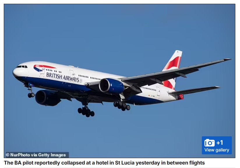 PILOT DIED - British Airways Flight BA2158 (UVF-LGW) Saint Lucia to London, Pilot died suddenly Nov.3, 2024, during layover after collapsing in front of Tourists at Luxury Saint Lucia ResortWilliam MakisNov 09, 2024∙ Paid1885630ShareContinue reading this post for free, courtesy of William Makis.Claim my free postOr purchase a paid subscription.