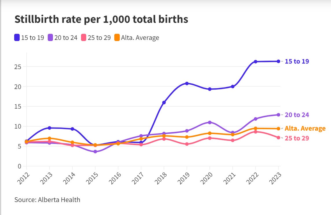 Steep rise in rate of stillbirth among young women in Alberta - Alberta government accidentally admits a huge rise in stillbirths in young Alberta women - up to 55% rise in stillbirths in 2023!!