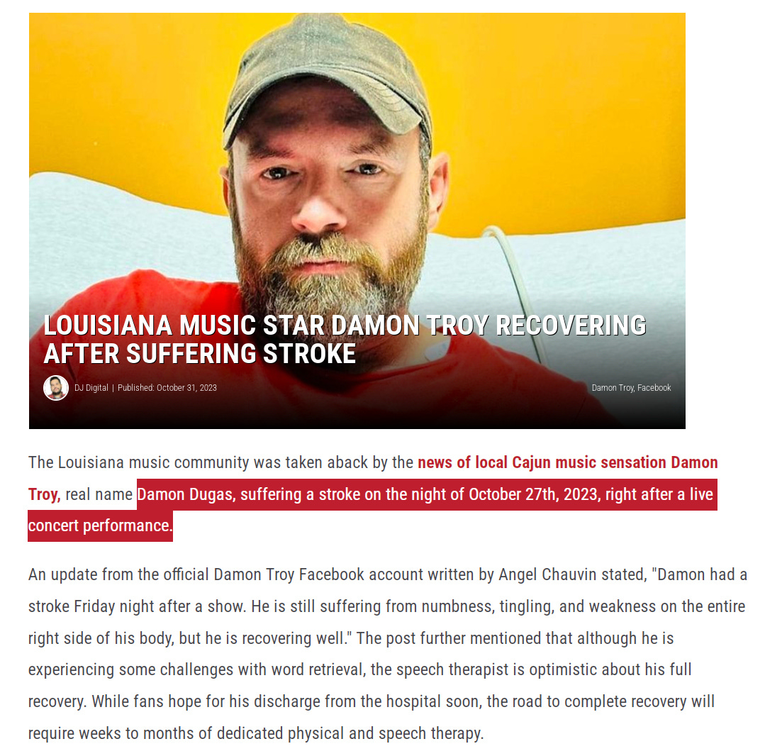 Oct.27, 2023 - 41 year old Louisiana Music star Damon Troy suffered a stroke on the night of Oct.27, 2023 right after a live concert performance. "still suffering from weakness on entire right side of his body"