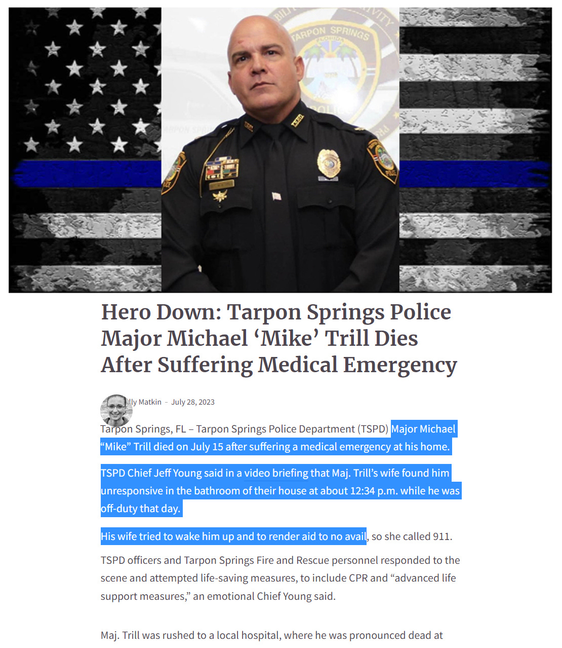 July 15, 2023 (above) - Tarpon Springs, FL - Tarpon Springs Police Department Major Michael MIke Trill died on July 15, 2023 after suffering medical emergency at home