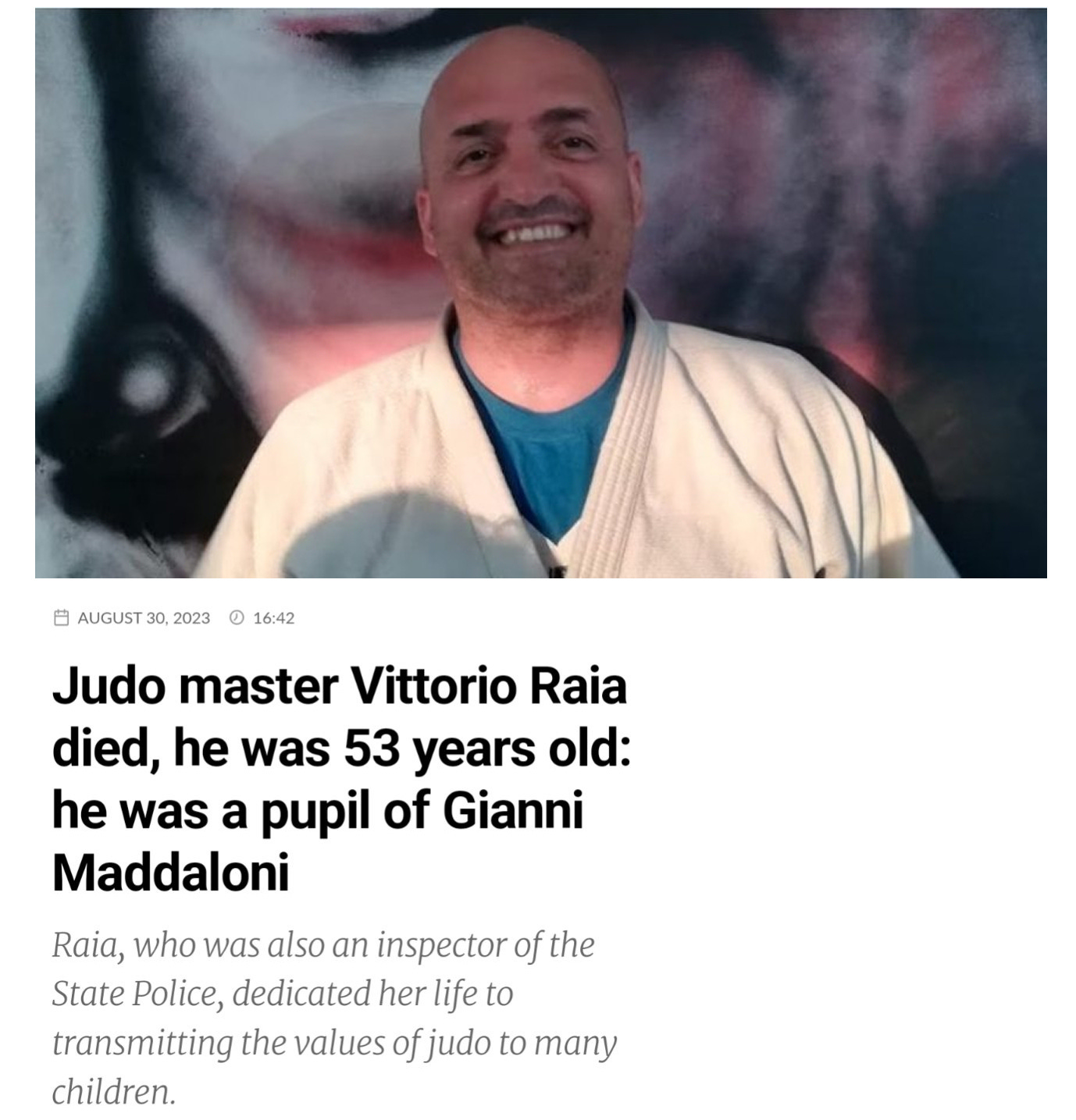 Aug.30, 2023 - Campania, Italy - 53 year old Judo Master Vittorio Raia, died suddenly on August 30, 2023. He was also a police officer.