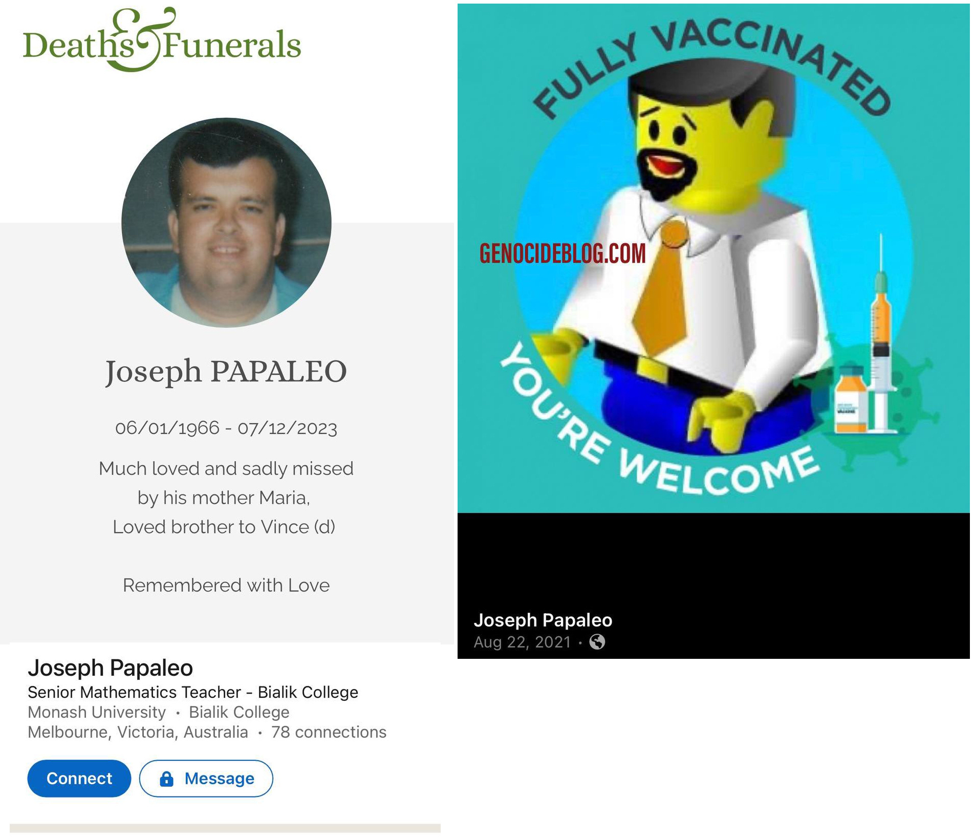 Dec.7, 2023 - Melbourne, Australia - 57 year old Joseph Papaleo, math teacher, died unexpectedly.