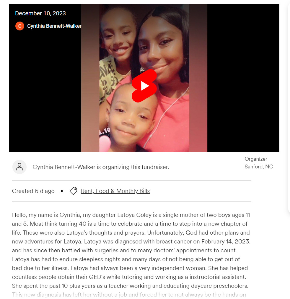 Dec.10, 2023 - Sanford, NC - 40 year old Latoya Coley, a teacher for daycare preschoolers was diagnosed with breast cancer.