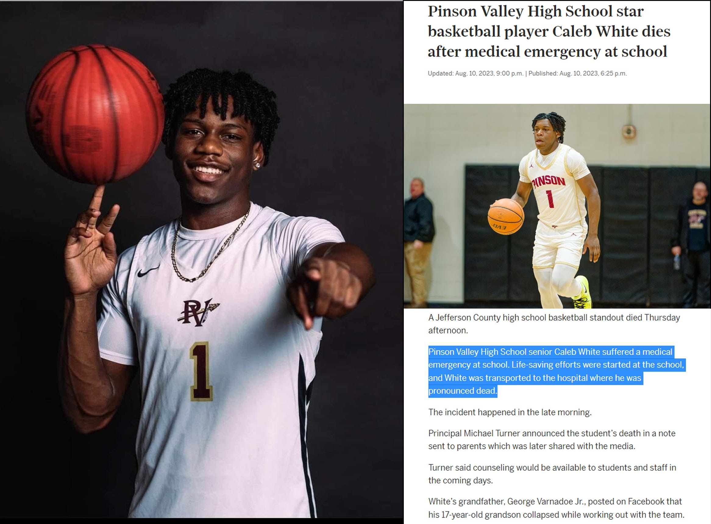 Aug.10, 2023 - Pinson, AL - 17 year old Caleb White, basketball player at Pinson Valley High School, collapsed at school late morning while working out with his basketball team, died suddenly of cardiac arrest (click here)