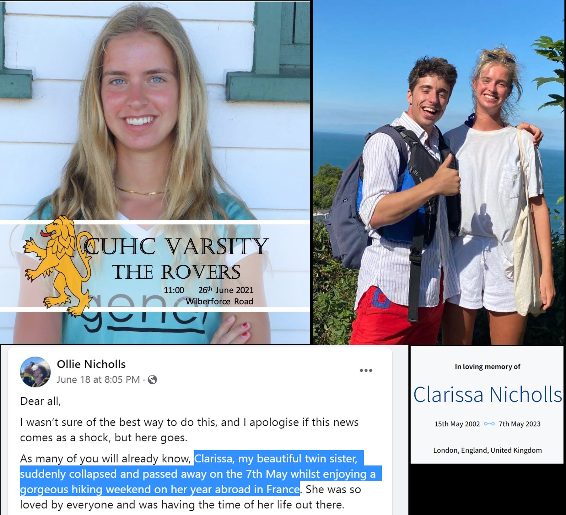 May 7, 2023 - London, UK - 20 yo Clarissa Nicholls was studying languages at Cambridge University. She went for a trip to France in May 2023. She collapsed & died suddenly from cardiac arrest on May 7, 2023 while hiking in France. It’s virtually a certainty that she was COVID-19 Vaccinated.