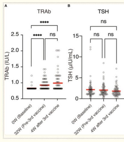 These effects were long-lasting (> 32 weeks). The increase of thyroid auto-antibodies (TRAb) after 2 jabs and after booster jab can be seen in the graph below: