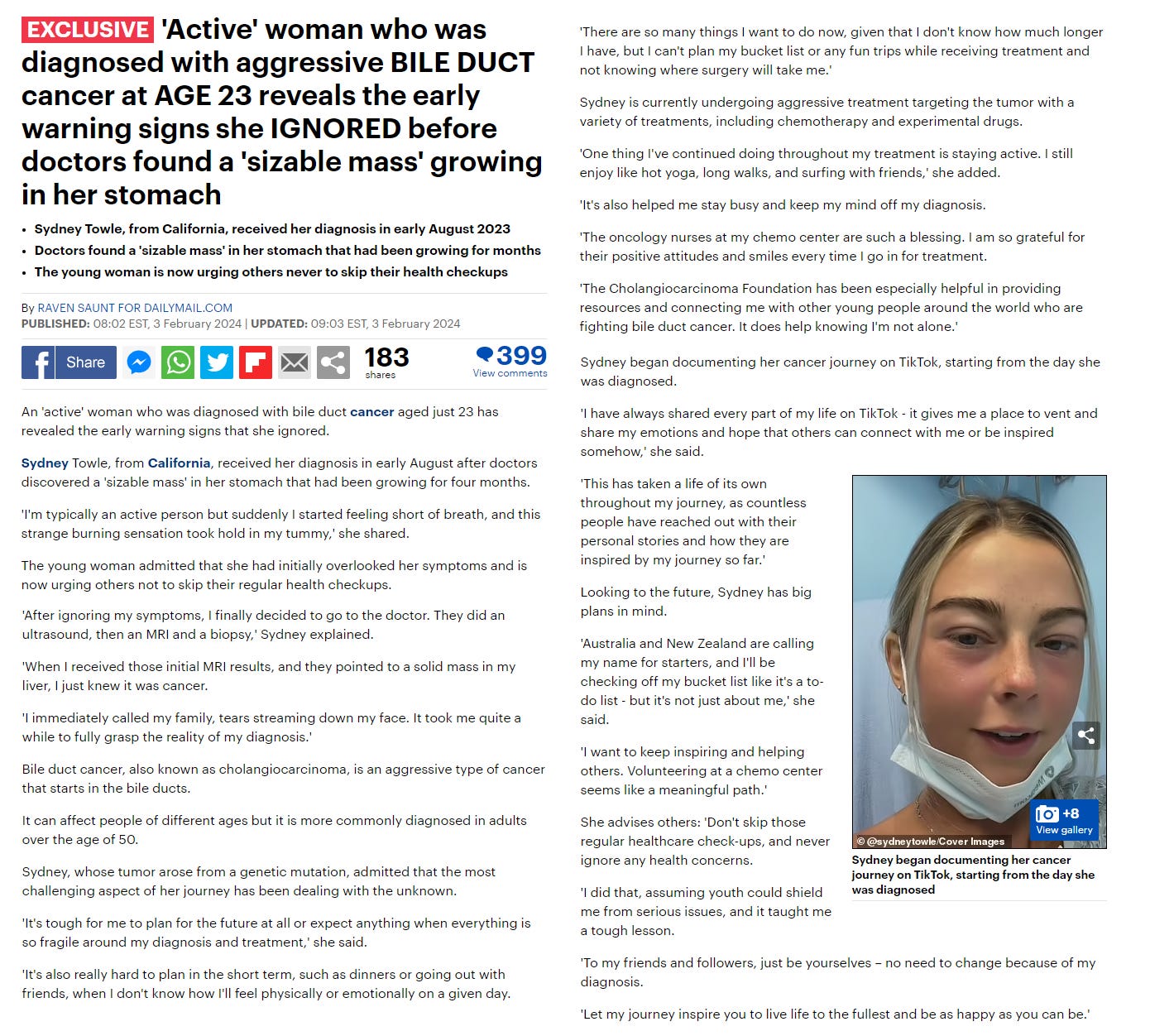 California - 23 year old Sydney Towle was diagnosed with a cholangiocarcinoma (bile duct cancer) in August 2023 after doctors “discovered a sizeable mass in her stomach that had been growing for four months”.