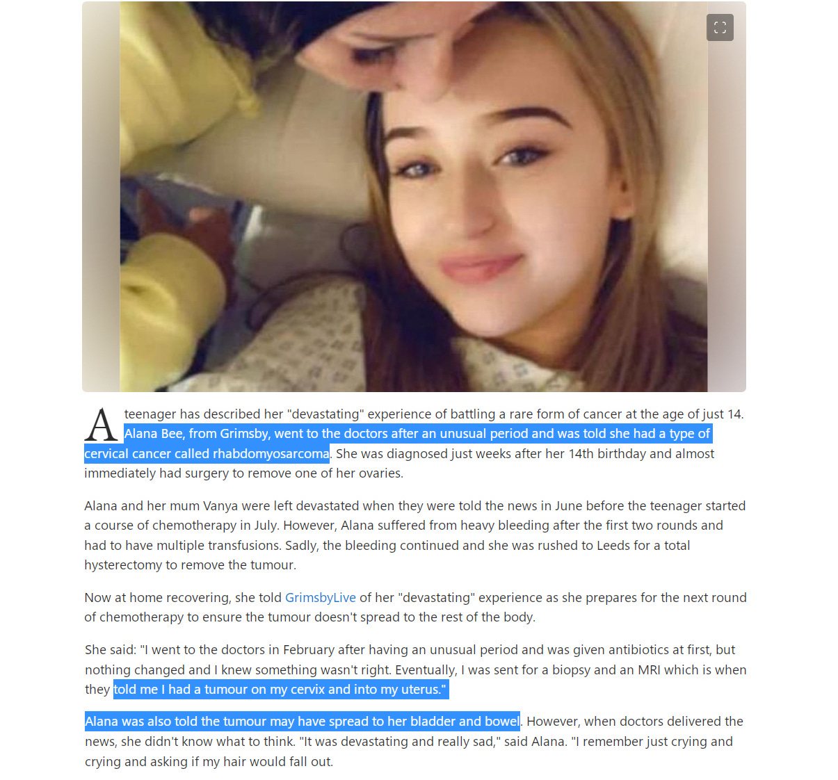 TURBO CANCER IN CHILDREN Ages 10-19: SARCOMA - Link to Pfizer COVID-19 mRNA Vaccine Established in VAERS - 14 year old UK girl diagnosed with Rhabdomyosarcoma of the Cervix - 24 Tragic Sarcoma cases