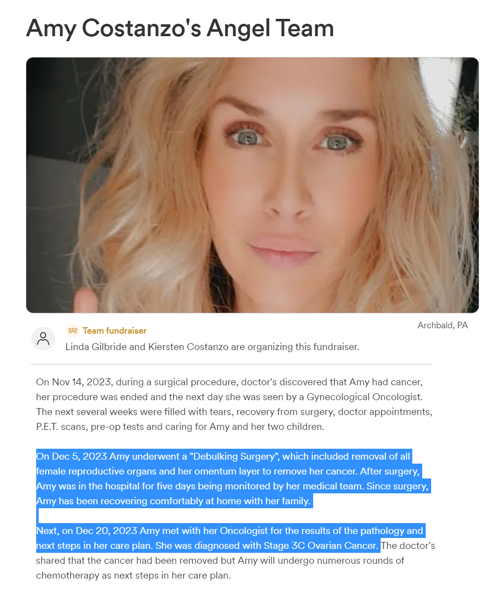Dec.28, 2023 - Archbald, PA - Amy Costanzo was diagnosed with Stage 3C Ovarian cancer. She has had to have extensive “debulking surgery” which included removal of all female reproductive organs and her omentum layer