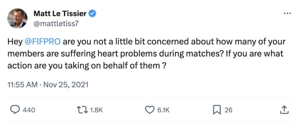 ‘On 25 November 2021 I tweeted to FIFPRO (the Fédération International des Associations de Footballeurs Professionnels, worldwide representatives for 65,000 professional footballers): ‘Hey @FIFPRO are you not a little bit concerned about how many of your members are suffering heart problems during matches? If you are what action are you taking on behalf of them?’